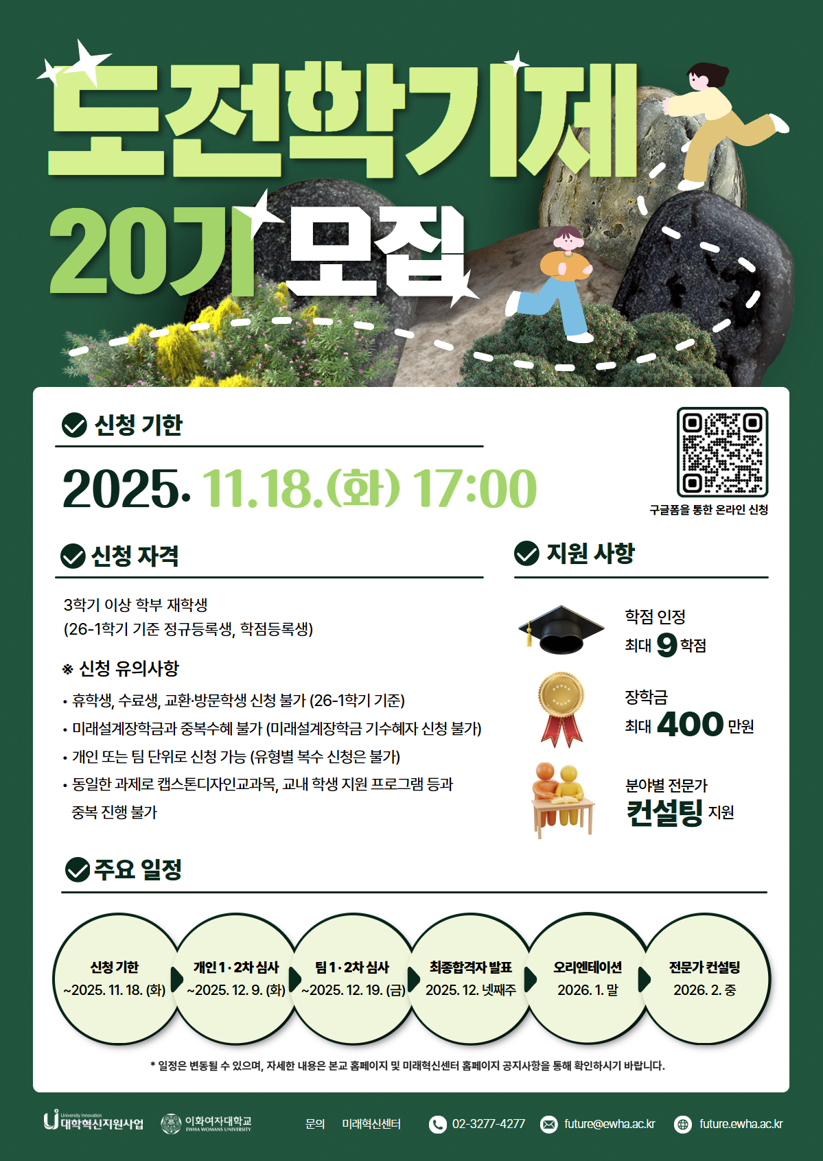대학혁신지원사업의 일환으로 20기 도전학기제 공모전을 시행합니다. 관심있는 학부생 여러분은 참고하시기 바랍니다.